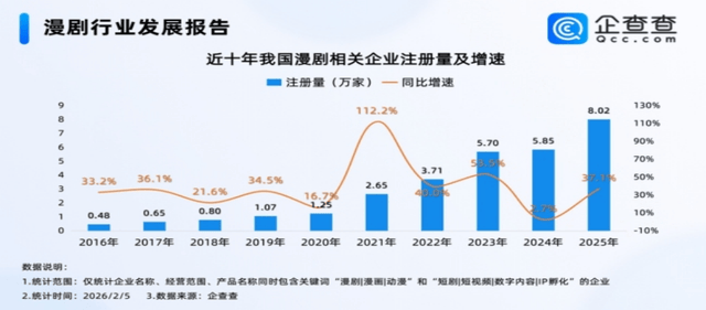 从市场规模来看,AI漫剧正处于爆发式增长阶段。DataEye研究院预计,2025年国内漫剧用户规模约1.2亿,占微短剧用户总量的三分之一,2026年有望增长至2.8亿。抖音巨量引擎显示,2025年6月至12月期间,漫剧播放量、用户规模复合增速分别达到24%、12%,每日自然流水大盘增长144%,广告营销流水增长超21倍。AI漫剧市场的快速扩张,吸引了地方政府、视频平台、互联网大厂及上市公司积极布局。企查查数据显示,2025年全年,我国累计注册漫剧相关企业达到8.02万家,相比2024年同期增长了37.1%。