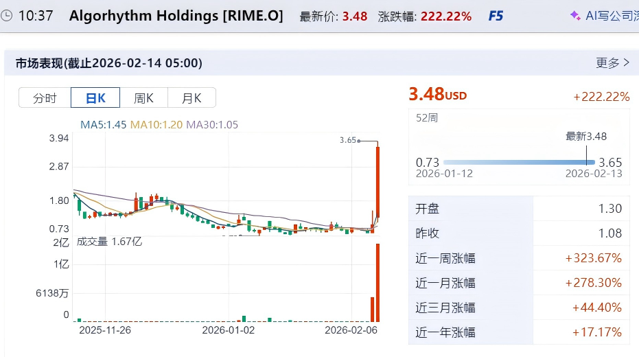 发布消息的Algorhythm股价则逆势上涨,2月12日收盘涨近30%,2月13日更是暴涨222.22%,从1.08美元飙升至3.48美元。两天内,市值增长约3倍。